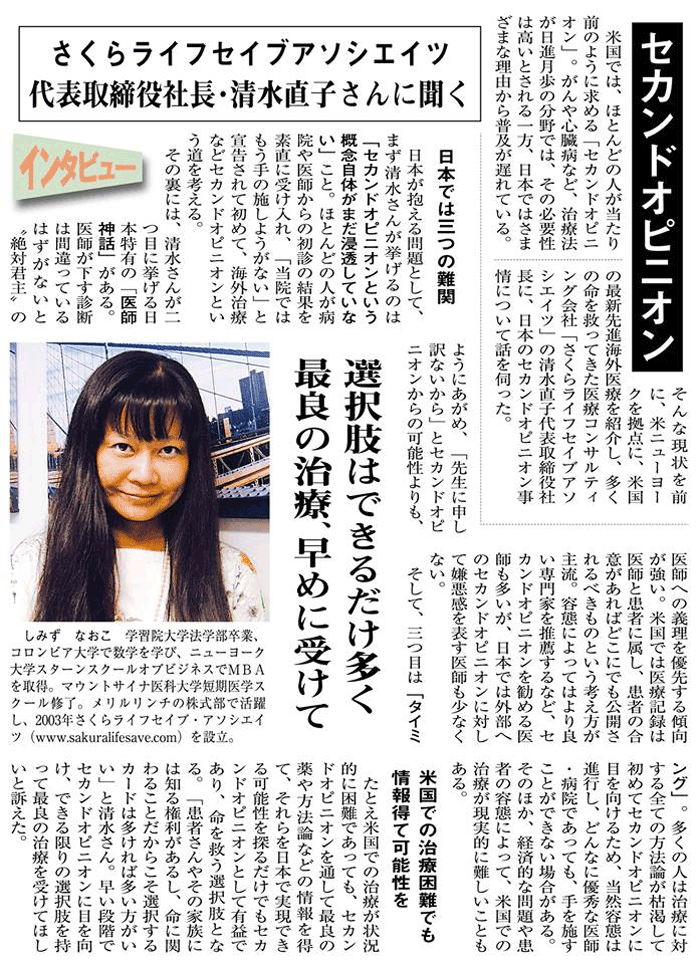 米国では、ほとんどの人が当たり前のように求める「セカンドオピニオン」。がんや心臓病など、治療法が日進月歩の分野では、その必要性が高いとされる一方、日本ではさまざまな理由から普及が遅れている。そんな現状を前に、米ニューヨークを拠点に、米国の最新先進海外医療を紹介し、多くの命を救ってきた医療コンサルティング会社、「さくらライフセイブアソシエツ」の清水直子代表取締社長に、日本のセカンドオピニオン事情について話を伺った。