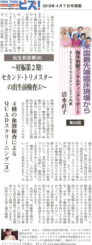 過去2回に亘って、セカンドトリメスターの出生前スクリーニングと診断の説明として、まず15週から20週の間に行われる4種の血液検査によるQUAD (クワッド)スクリーニングの説明を行っています。