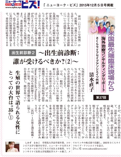 前回(11月7日号掲載)から、妊娠後、母親のおなかにいる赤ちゃんの染色体が正常であるかどうかを調べる出生前診断についての説明を開始しています。